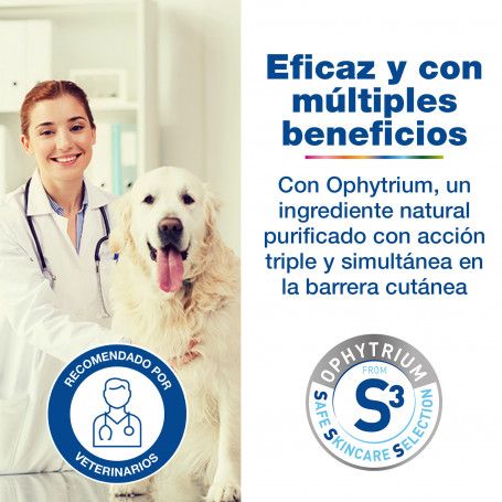 Los perros que tienen una falta de fitoesfingosina pueden llegar a desarrollar alteraciones de la piel, un sobrecrecimiento de bacterias y levaduras y dermatitis seborreica. Utilizando un champú con este componente contribuyes a reestructurar la barrera de la piel, reducir las irritaciones y disminuir los rebrotes en los casos de seborrea. Además, su fórmula también contiene ácidos grasos y antimicrobianos naturales, alga roja hidrolizada y colágeno.