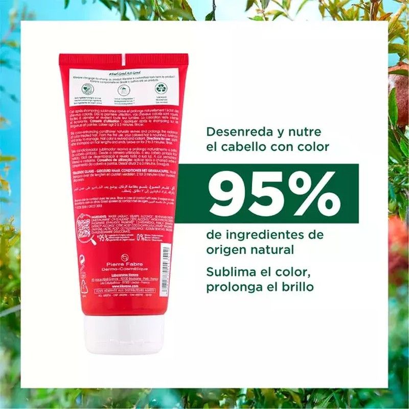 Envase de 200 ml. Rico en taninos de Granada, este cuidado captura y fija el color y desenreda el cabello de forma instantánea, reparando al mismo tiempo las zonas alteradas del cabello proporcionándole brillo. Protegido, la coloración se reaviva y resplandece. El cabello recupera su suavidad y sedosidad.