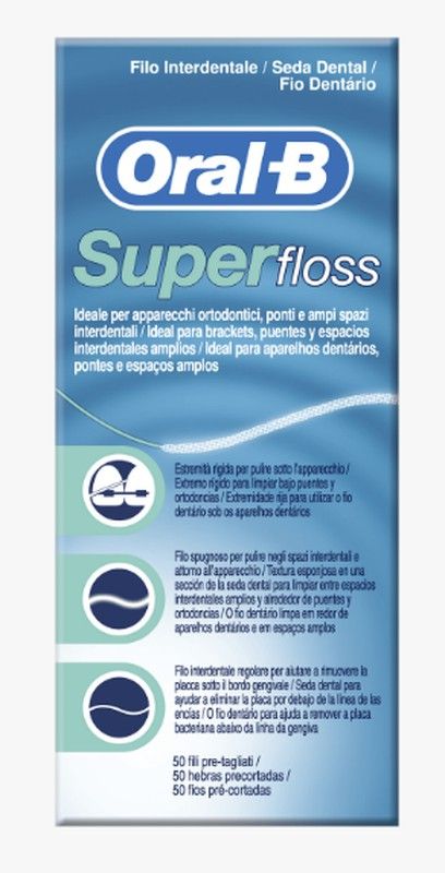 Oral-B Super Floss Hilo incluye tres componentes: un extremo rígido, una porción esponjosa y una sección de seda dental estándar.