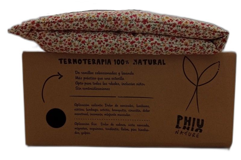 Cojines térmicos Phiu Phiu Nature Termoterapia 100% natural Cojines térmicos de semillas seleccionadas de alta calidad y lavanda. Su aplicación puede darse en caliente para dolores de cervicales, lumbares, ciática, lumbago, artritis, bronquitis, sinusitis, dolor menstrual, insomnio y relajante muscular, o en frio para dolor de cabeza, vista cansada, migrañas, esguinces, tendinitis, fiebre, pies hinchados o golpes. La bolsa térmica tiene un efecto similar a los hot-cold pack tradicionales pero mucho más natural, y sobre todo una mejor adaptabilidad al cuerpo, sin peligro de quemaduras por calor o frío. Disponible en diferentes estampados. Apto para todas las edades y sin contraindicaciones. Tamaño: 60 cm x 15 cm