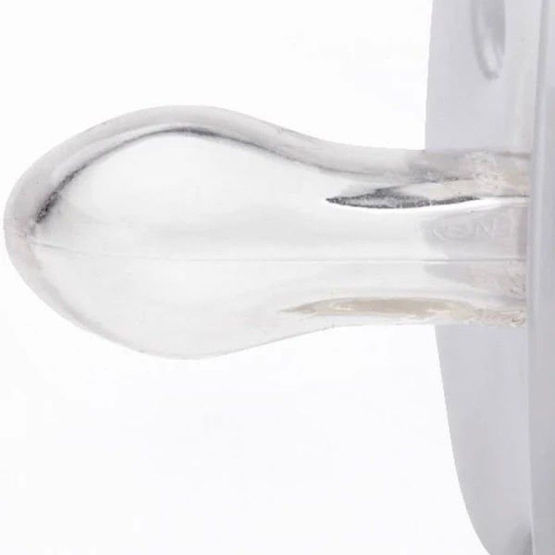 La tetina fisiológica, más estrecha y plana en la base, permite que el chupete quede bien colocado en la boca del bebé, ejerciendo la mínima presión sobre el paladar. La tetina anatómica imita la forma del pezón materno durante la succión y se adapta perfectamente al paladar del bebé.