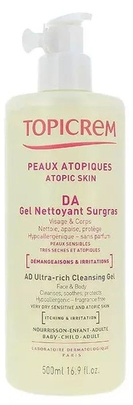El DA GEL LIMPIADOR SOBREGRASO ha sido formulado especialmente para la higiene diaria de las pieles sensibles, muy secas y atópicas de Recién nacido, niños y adultos. Su base limpiadora lubricante ultrasuave, sin perfume ni jabón, contiene un complejo de activos relipidizantes y antirritantes (aceite de lino, biolípidos y alantoína) para proteger la barrera cutánea. Estándares de alta seguridad: fórmula desarrollada para Recién nacido y niños; sin perfume, sin jabón. Testado en pieles atópicas bajo control dermatológico, pediátrico y oftalmológico. No irrita los ojos. Textura suave y olor agradable. Máxima protección gracias al complejo de activos relipidizantes y antirritantes: aceite de lino + biolípidos + alantoína.